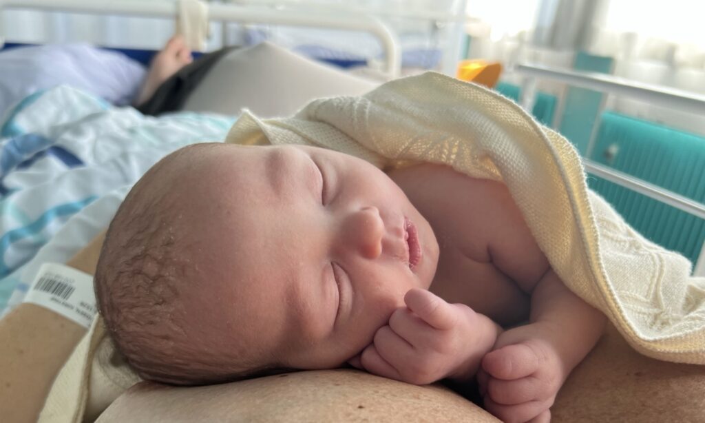 Efter en stund lyftes hon tillbaka till bordet, där hon blev inbäddad i en liten filt och sedan överlämnad till min partner. Där låg hon medan jag blev sydd, vilket bara tog omkring 20 minuter. Därefter rullades vi iväg till uppvakningsrummet och senare vidare till BB-avdelningen, där vi stannade de närmaste tre dagarna.