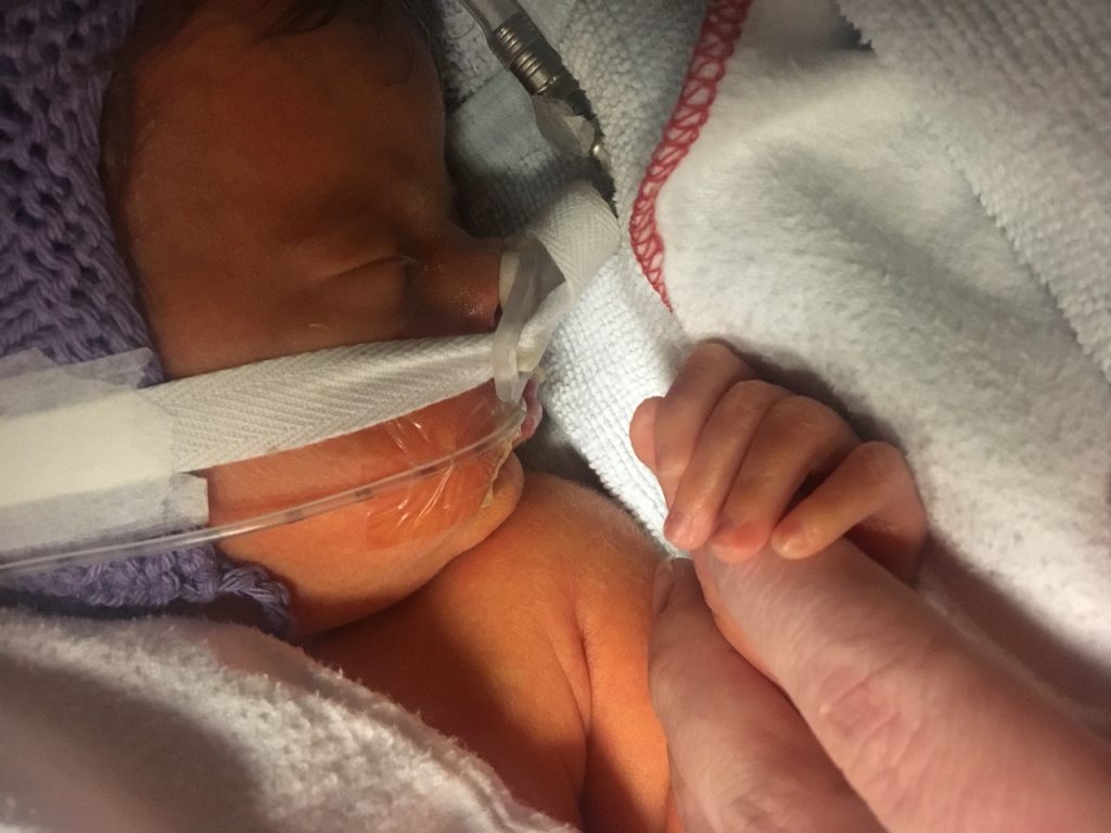 De första två veckorna efter Emmas födelse var vi inlagda. Först en vecka på Rigshospitalet och därefter en vecka på Næstved Sygehus. Emma hade svårt att andas själv och behövde syrgas och c-pap för att klara av sina apnéer. Hon hade väldigt svårt att amma, och vi var tvungna att snabbt ge upp och gå över till flaska. En sond lades in i hennes näsa, så vi kunde komplettera med den mängd hon inte själv kunde få i sig. Men även där kämpade hon, och vi gjorde allt vi kunde för att hjälpa henne att äta på egen hand.